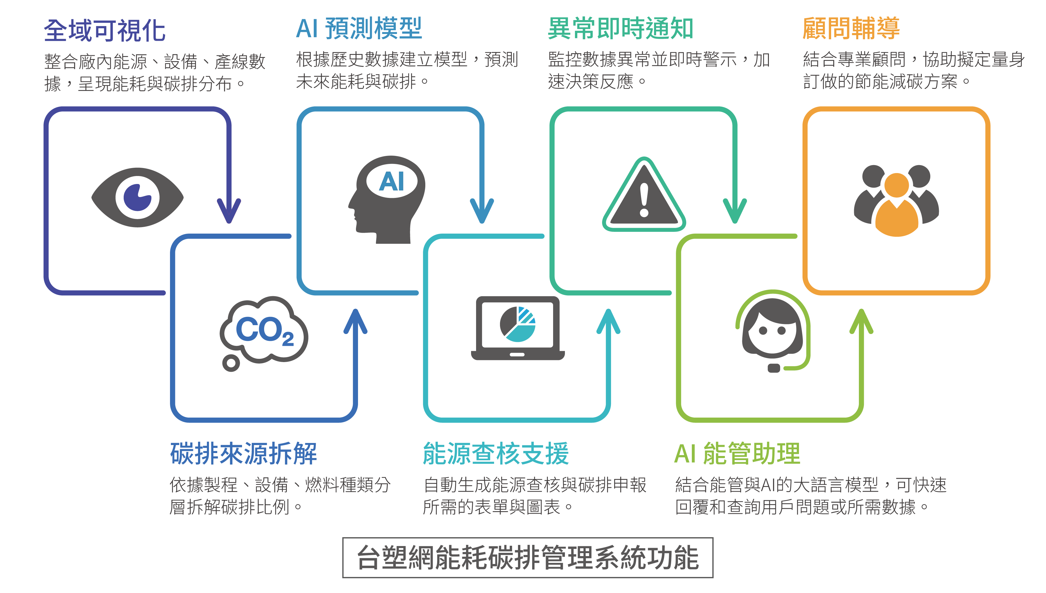 ▲台塑網能耗碳排管理系統核心涵蓋「能源管理」、「碳排管理」與「AI智慧輔助管理」三大面向。