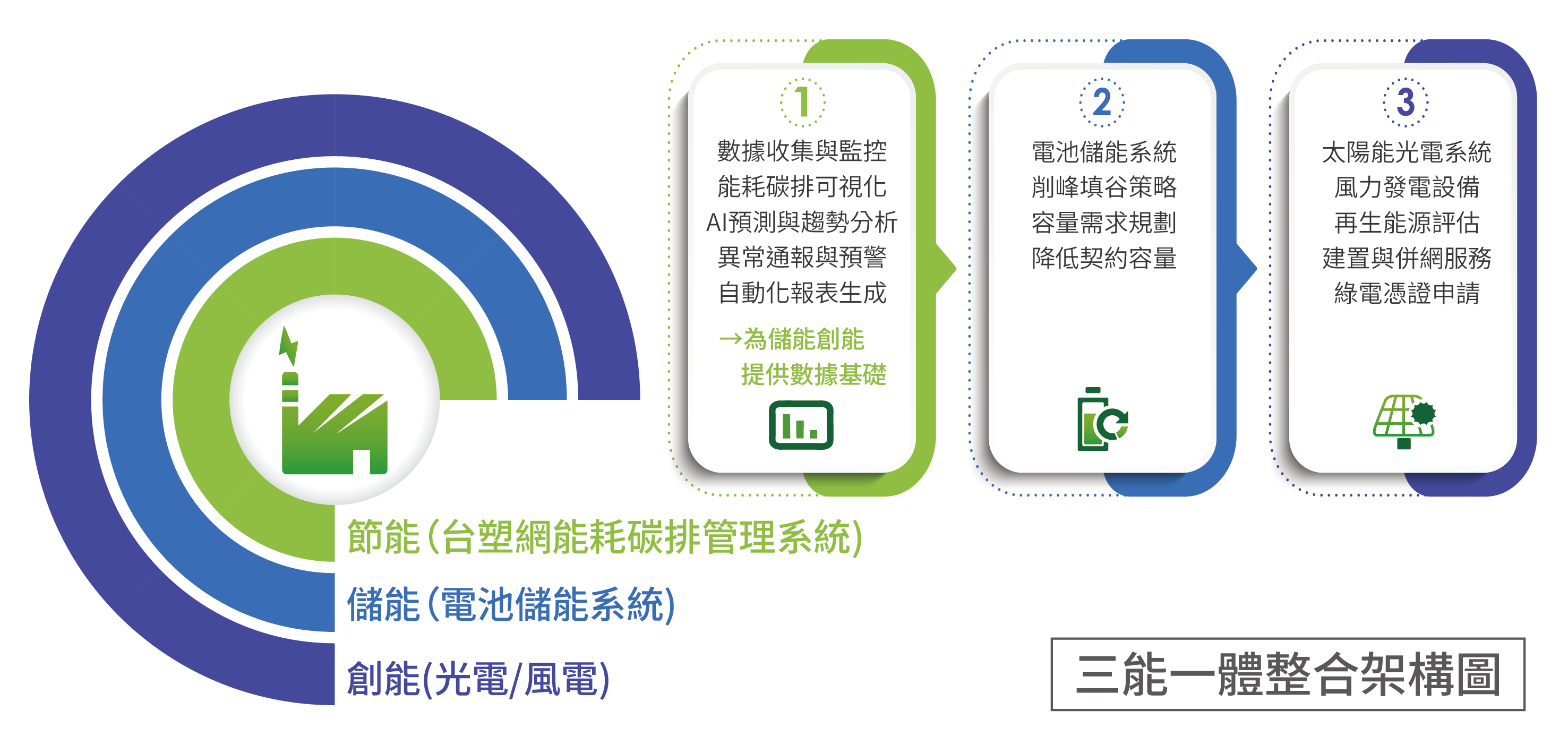 台塑網能耗碳排管理系統透過將能耗資訊可視化、圖形化,協助企業構築扎實的減碳基礎,結合能源產業上下游廠商在儲能與創能領域的專業能力,建立「三能一體」的完整生態系統,讓企業能夠從被動應對轉為主動管理,從成本負擔轉為競爭優勢。
