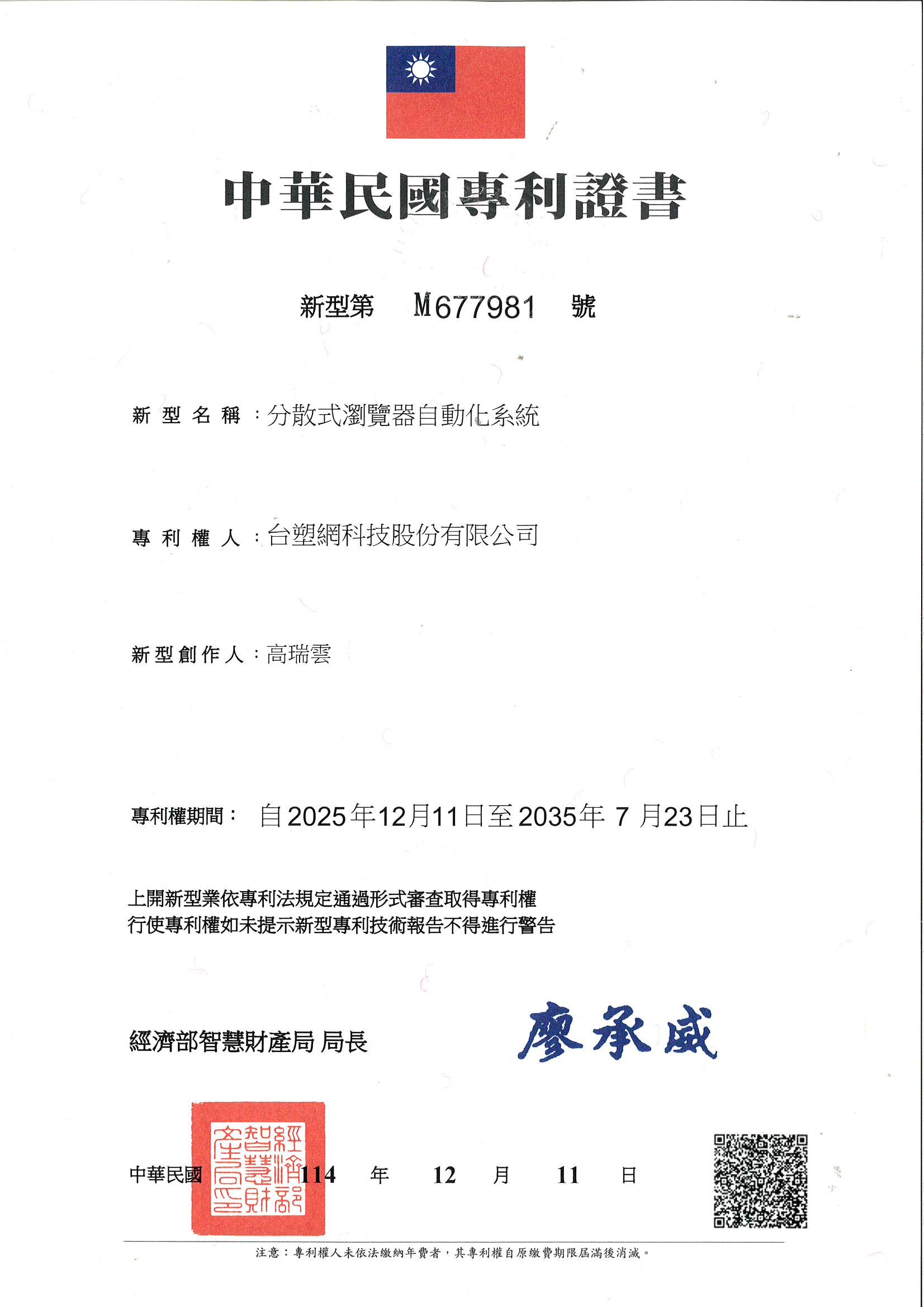圖說:分散式瀏覽器自動化系統新型專利證書