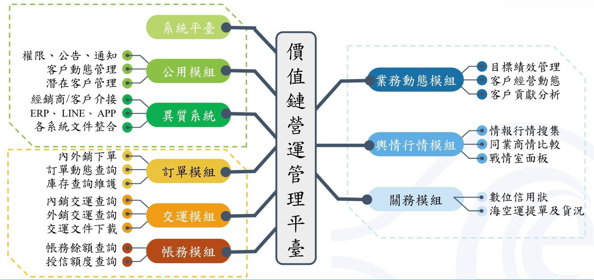 台塑網「價值鏈營運管理平台」以數據驅動與AI賦能為核心,完整串聯售前、銷售、售服流程。平台深度整合內外部數據,合法串接外部行情。其提供公用、訂單、交通、帳務、業務動態、輿情行情、關務等七大類模組供企業彈性選購,並支援地端部署與雲端安全串接。